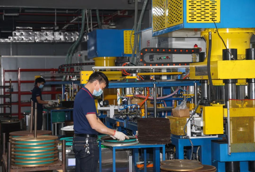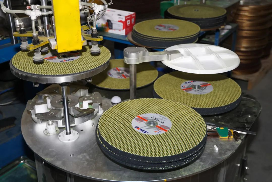 步入車間,智能化設(shè)備高效運(yùn)轉(zhuǎn),厚度1至6毫米的砂輪經(jīng)過精密加工后整齊排列,即將發(fā)往全球市場。